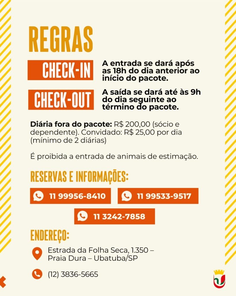 Para consultar a disponibilidade e efetuar o pagamento do seu pacote, entre em contato conosco nos telefones: (11) 3242-7858 / WhatsApp: (11) 99956-8410 ou (11) 99533-9517. O telefone da colônia em Ubatuba é o (12) 3836-5665.