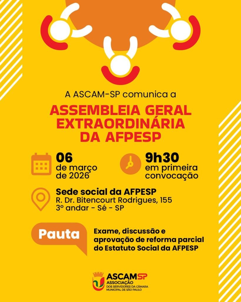 A ASCAM-SP comunica que, no dia 06 de março, , às 9h30 (1ª convocação), na sede da AFPESP, acontecerá a Assembleia Geral Extraordinária da Associação dos Funcionários Públicos do Estado de São Paulo (AFPESP).