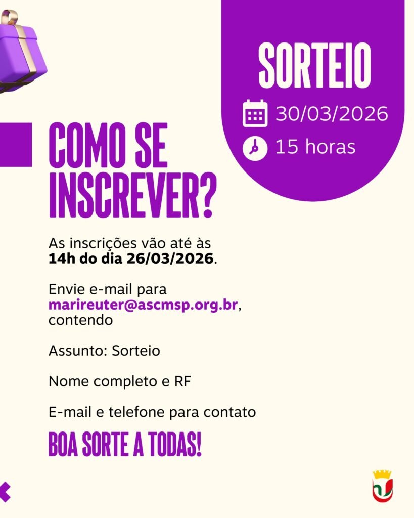 As inscrições vão até às 14h do dia 26/03 e o sorteio será no dia 30/03, às 15h. Confira as condições nas imagens e participe!