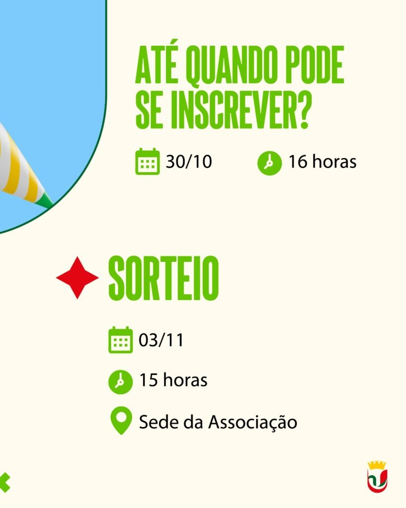 O sorteio acontecerá no dia 3 de novembro, às 15h, na sede da Associação. Não fique de fora, participe!