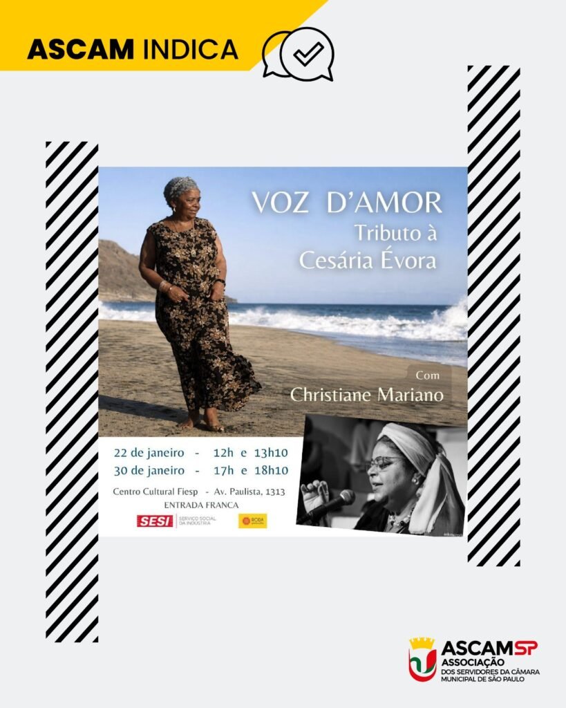Convidamos todos os associados e amigos para o show “Voz D’Amor – Tributo à Cesária Évora”, com a nossa querida associada e servidora aposentada da CMSP, Christiane Mariano.
