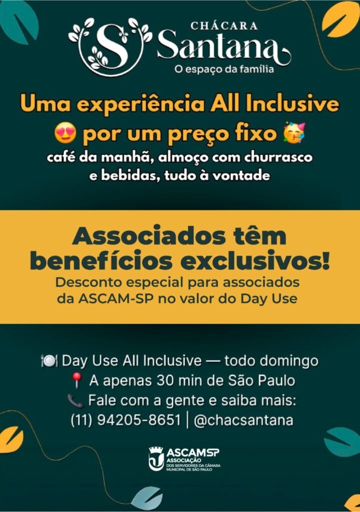 Está em busca de uma experiência All Inclusive para toda a família? Existe um parceiro ideal da ASCAM-SP para te atender: na Chácara Santana você aproveita um buffet à vontade o dia todo por um valor fixo.