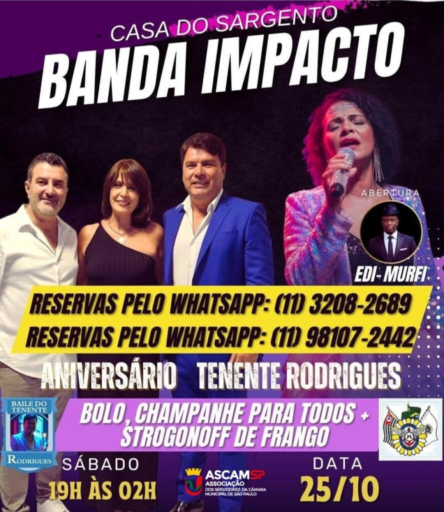 A festa está garantida! No dia 25 de outubro, venha comemorar o aniversário do Tenente Rodrigues com muita música, alegria e boa companhia na Casa do Sargento, em São Paulo. A noite contará com o show especial da Banda Impacto, além da abertura de Edi Murfi, prometendo um repertório animado e cheio de energia! O […]